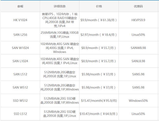 在这里,可以看到特价活动的VPS主机产品,比如512MB内存方案的(20GB硬盘/200GB流量)Linux/Windows圣何塞机房VPS主机将近2个月,或者购买1GB方案(40GB硬盘/400GB流量)可以免费使用1个月。