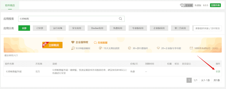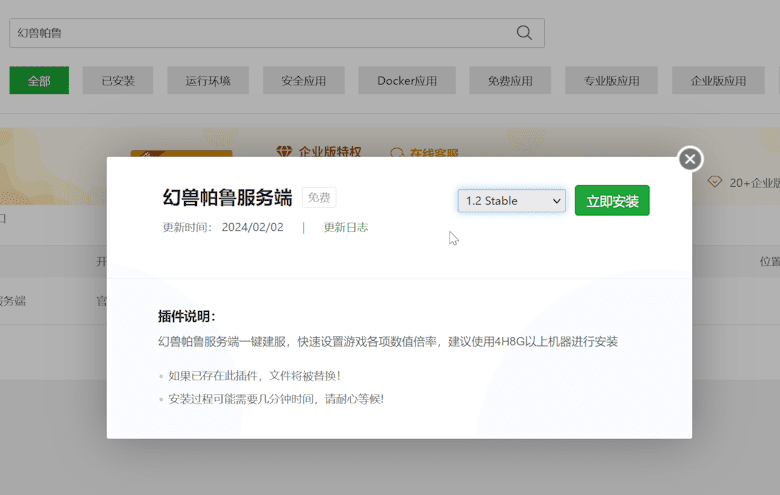 这里,我们在安装宝塔面板配置简单的WEB LNMP或者LAMP之后,在到商店中找到 幻兽帕鲁服务器的插件,直接安装。