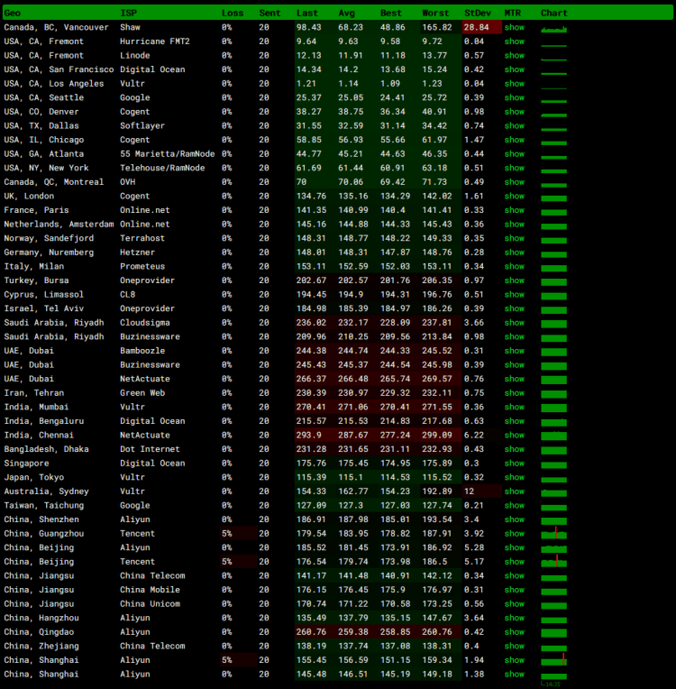 全球随机节点的PING速度测试。丢包还是比较少的。
