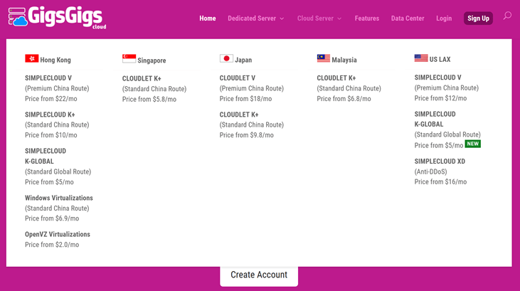 这里我们看到下图,可以看到Cloud Server云主机,可以看到有香港、新加坡、日本、马来西亚、美国等机房。China Route是直连线路,中文速度优秀。
