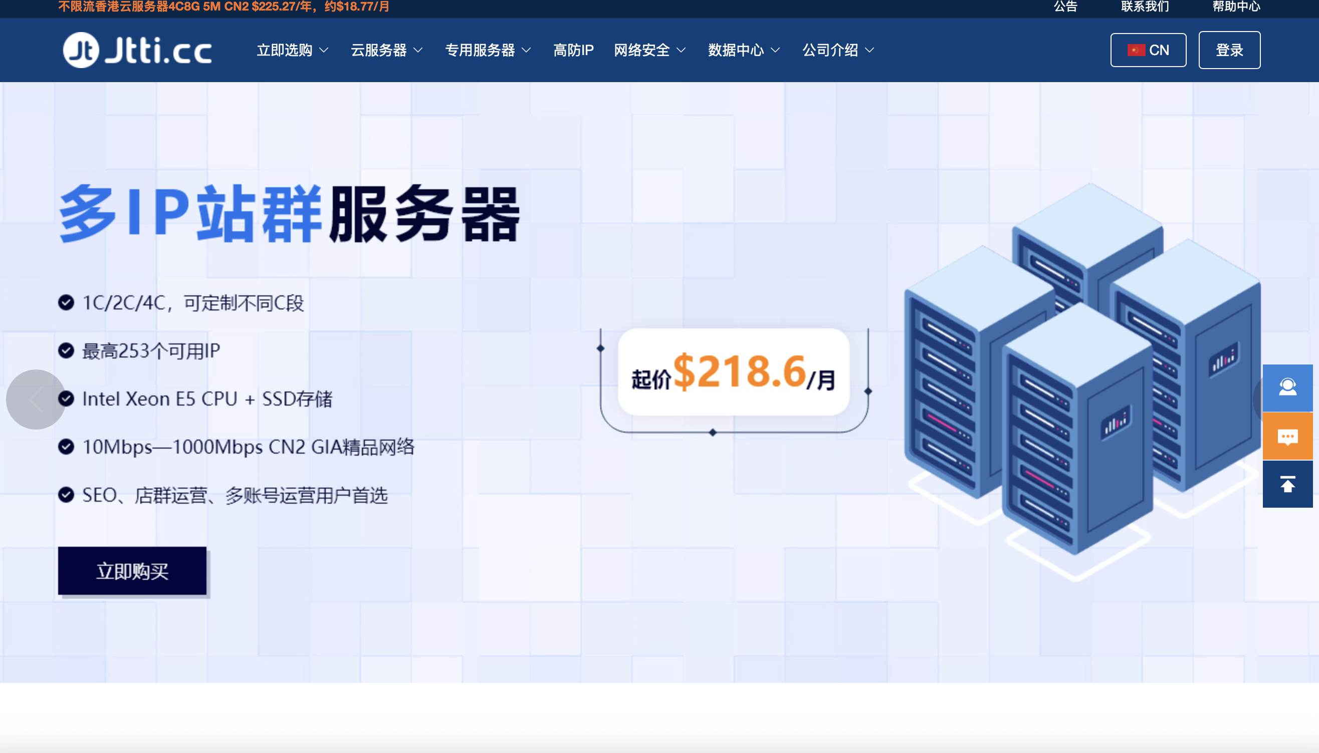 Jtti.cc,是一家新加坡IDC服务商,主要提供云服务器和专用服务器,针对中国大陆提供高端CN2 GIA线路和BGP大陆优化线路,建站是非常稳定的,美国洛杉矶机房130ms~160ms延迟,基本无丢包,晚高峰时期也很稳定,而且还支持一键快照备份,完全root访问权限,智能弹性扩容,提供24*7专业技术支持。