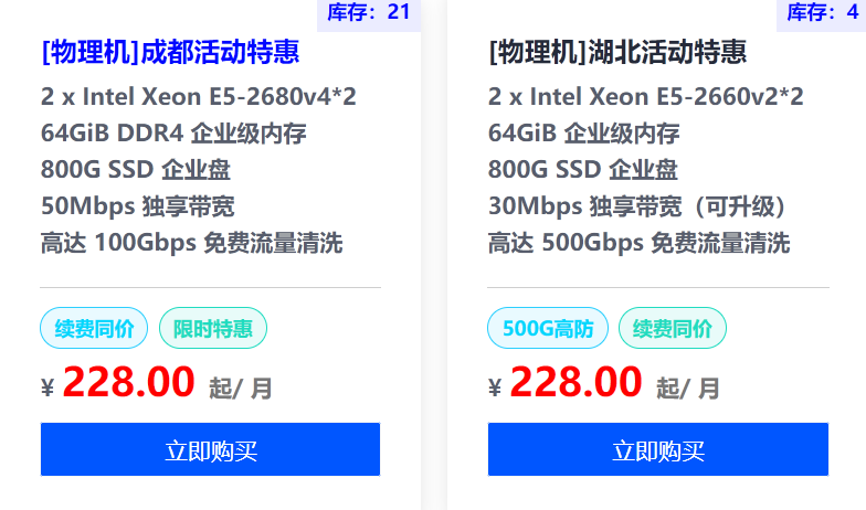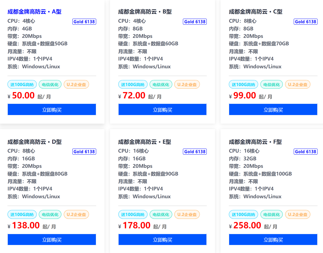 | 成都电信 | 16H | 16G | 50M | 109¥/月 | 点击直达 |