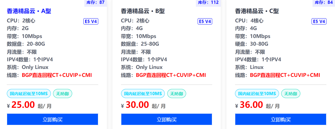 | 香港BGP | 4H | 4G | 10M | 279¥/年 | 点击直达 |