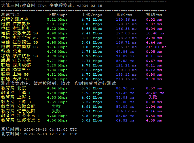 三网+教育网 IPv4 多线程测速,下载和上传都跑满了,带宽很足:
