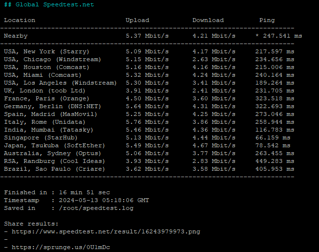 测试iperf3海外网络的上传和下载速度,受限于这台服务器网络只有5M: