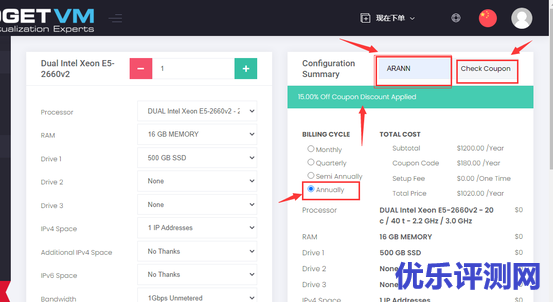 BugetVM优惠码在下单页面,右上角直接输入进去,点击Check Coupon,就使用成功了。记得选择购买周期哦!