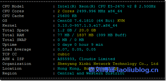 本文所涉主机基于KVM架构,配置为双核CPU+2GB内存+20GB硬盘,5M上行带宽,这也是目前官网销售的最低套餐,操作系统为纯净CentOS7.6,未安装加速工具。