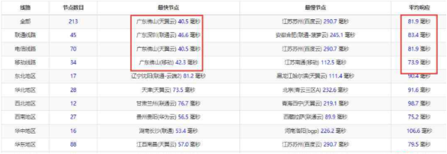 从测试结果可以看到,三网Ping的平均延迟在81ms左右,其中居然是移动网络延迟是最低的,其次是电信、联通。不过整体而已三网延迟都差不多。另外你也可以看到在东南沿海的广东地区,延迟更是低到只有40ms左右,可谓是相当给力的。