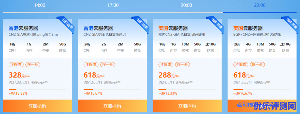 活动期间,每天14点,17点,20点,22点,4款免备案海外云服务器准时开秒,每个ID限购一台。