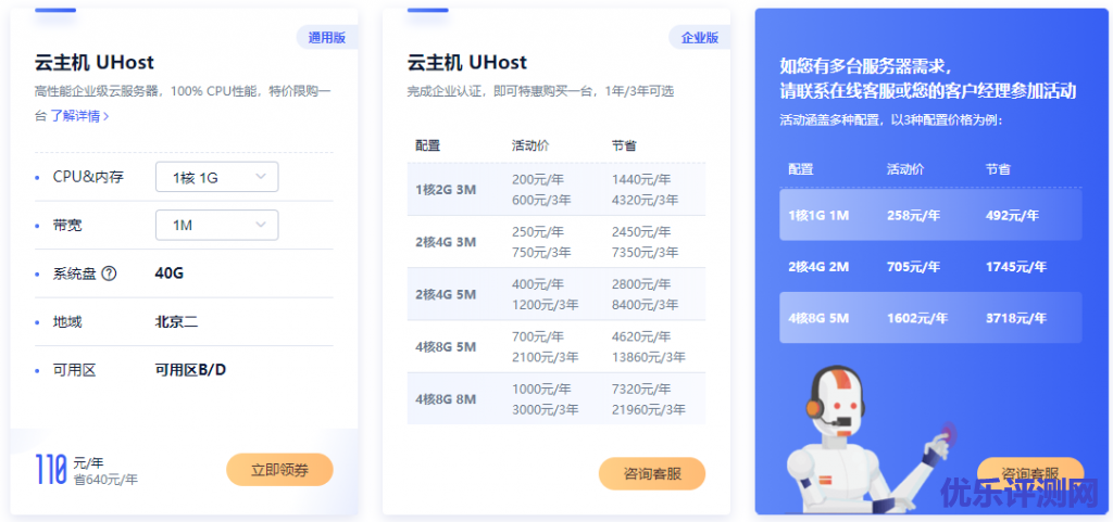 注册UCloud账户并完成企业实名认证的用户,不限新老用户,可以购买一台特惠云主机,1年/3年可选,购买3年,特惠福利3倍享!活动地址:https://www.ucloud.cn/site/active/1111.html