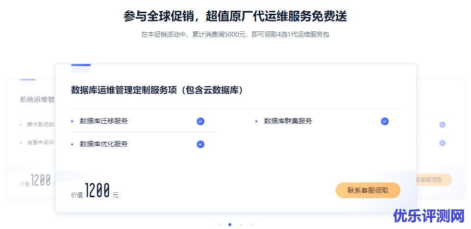 除UCloud数据库优惠外,UCloud还推出了参与全球促销,超值原厂代运维服务免费送活动:在本促销活动中,累计消费满5000元,即可领取4选1代运维服务包。