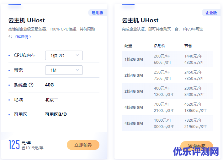 云主机配置 1核CPU&2G内存,1M带宽,40G数据盘,125元/年,省1015元/年