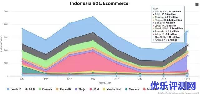 图 2. 印尼 Top B2C、C2C 电商平台月访问量(2017.03 – 2017.10)