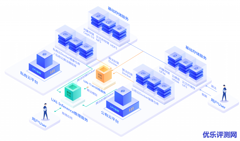 - 2UAI-Train训练服务基于UCloudGPU计算集群构建,训练节点配置SSD本地存储,后端目前可对接UFile对象存储、UFS文件存储,后续将支持UDisk等多种UCloud存储基础服务;