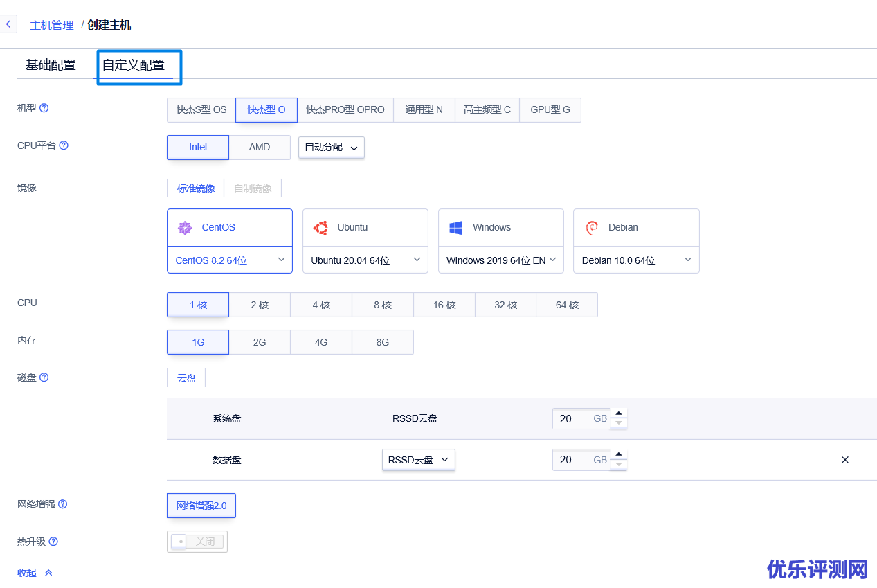 2)可自定义选择机型、CPU、内存、磁盘类型及大小。