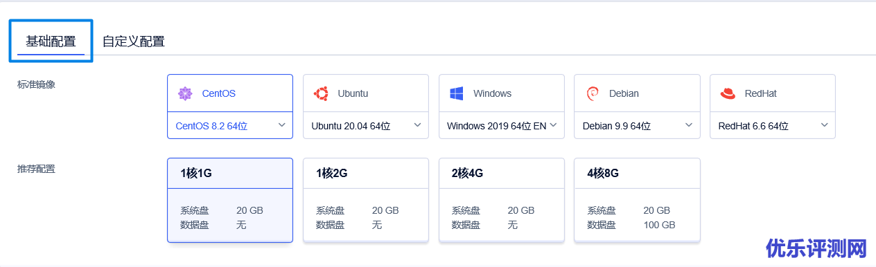 1)基础配置下只支持UCloud提供的标准镜像,若需选择自制镜像,请切换至自定义配置;