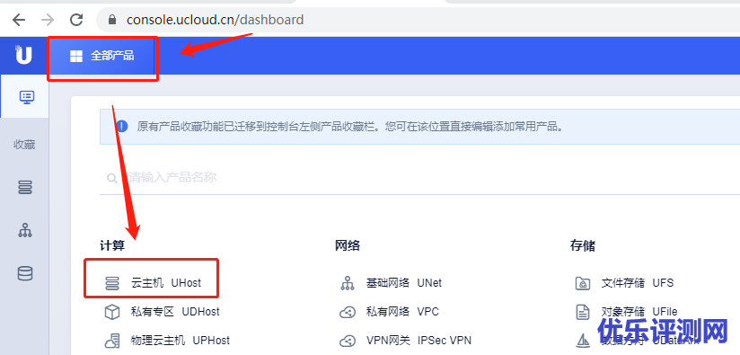 登陆UCloud账户后,进入控制台界面,也就是默认的资源统计界面,首先选择“全部产品”,然后选择“计算”模块下的“云主机 UHost”,进入UHost控制台界面。