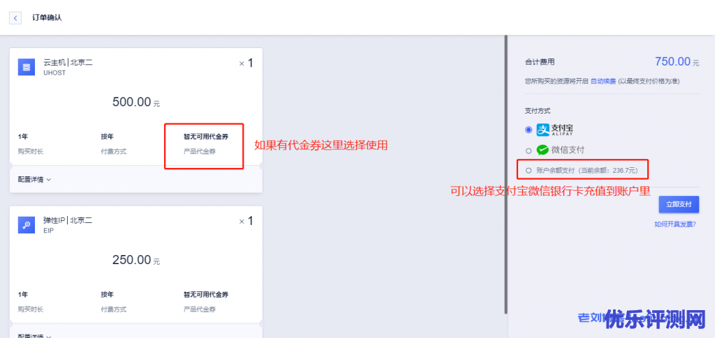选择合适的UCloud云主机计费方式后点击“立即购买”,进入支付方式选择如支付宝,微信,银行卡转账等。划重点,UCloud代金券如何使用?这里有代金券也是在这个界面选择使用的,很多人不清楚这一点,以为UCloud云产品代金券是在计费方式选择页面就使用的,其实不然。