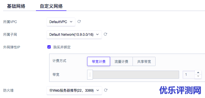 1)默认为您绑定1Mb的外网弹性IP,若暂无绑定外网IP的需求,可切换至自定义网络;