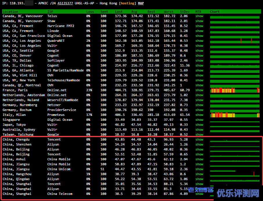 2、UCloud香港vps云主机测试全球节点抖动及丢包情况。红框位置是国内测试节点,电信、联通、移动三网均有测试节点。稳定性、丢包现象是非常少的。如果是用于建站的话,网站打开速度是有保障的。