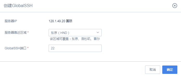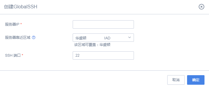 2.输入需要加速的服务器IP,选择可覆盖你服务器物理位置的区域选项,输入服务器的SSH端口号并创建。