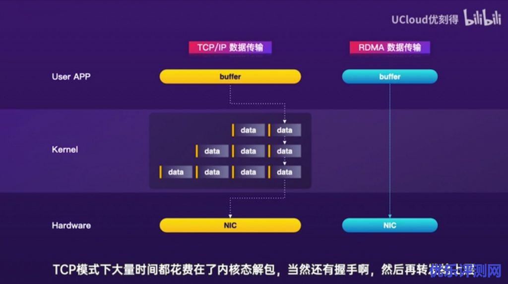 从上面原理对比图可知,TCP模式下大量时间花费在了内核态解包,当然还有握手然后转发给上层,而使用了RDMA模式,从网卡直接发送到应用程序缓存,使得整体存储性能,最终能达到120万IOPS。更多快杰云主机详情可至UCloud官网>>