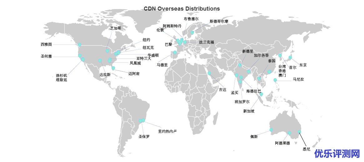 UCloud海外及港澳台CDN网络由自建机房、多家第三方供应商构成,每个数据中心有数以百计的分发服务器,并通过10GigE光纤与其他基础设施连接。能够承载3到5Tbps的流量传输,24小时一周七天不间断服务。