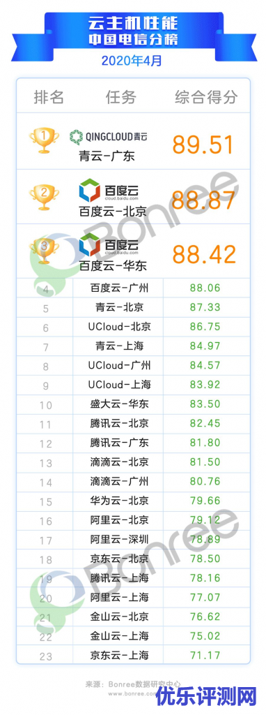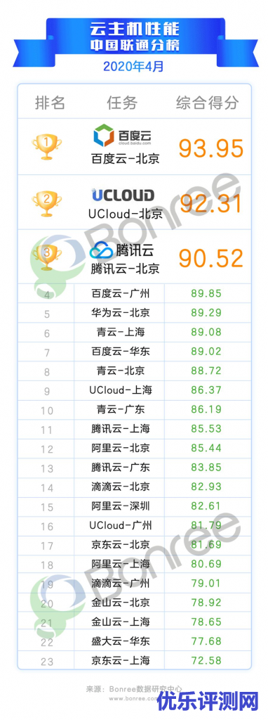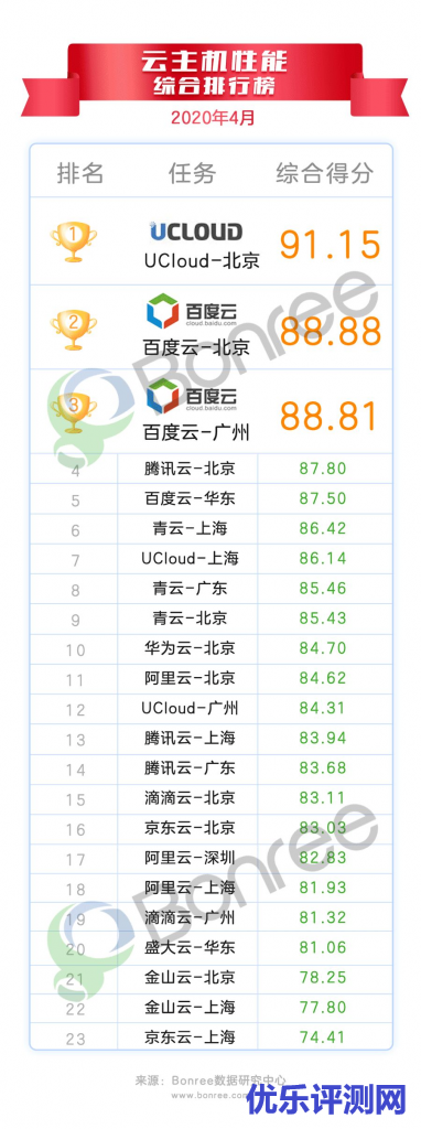 在2020年4月云主机性能综合排行榜中,UCloud-北京位居榜首,百度云-北京和百度云-广州分列第二、三名。