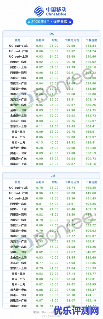 此榜主要反应在中国移动运营商覆盖下,各云平台在网络稳定和传输质量上的表现。
