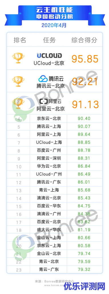老刘今天发现了一个有意思的微信文章《Bonree指数 | 2020年4月云主机性能评测报告》,这里转载来供大家参考,在选购云主机的时候老刘决定有一定帮助。作为UCloud粉的老刘看到评测结果很是欣慰,UCloud云主机的实力很是可以啊,榜单第一!
