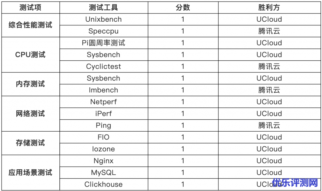 《选型指南》中腾讯云全胜,而《大PK》中则UCloud全胜,且两篇文章指标完全没有重叠。由于这些测试结论均可复现,我们相信两篇文章的测试结果是客观真实的。故直接引用其结论。