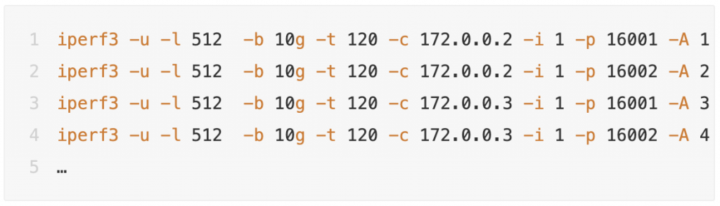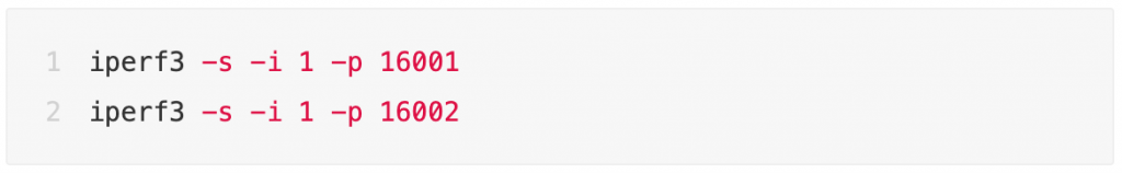 此测试中需要申请8台陪练机(16核64G),在每个陪练机中以server模式启动2个iperf3进程: