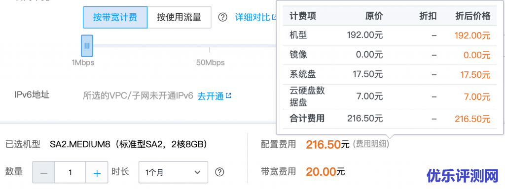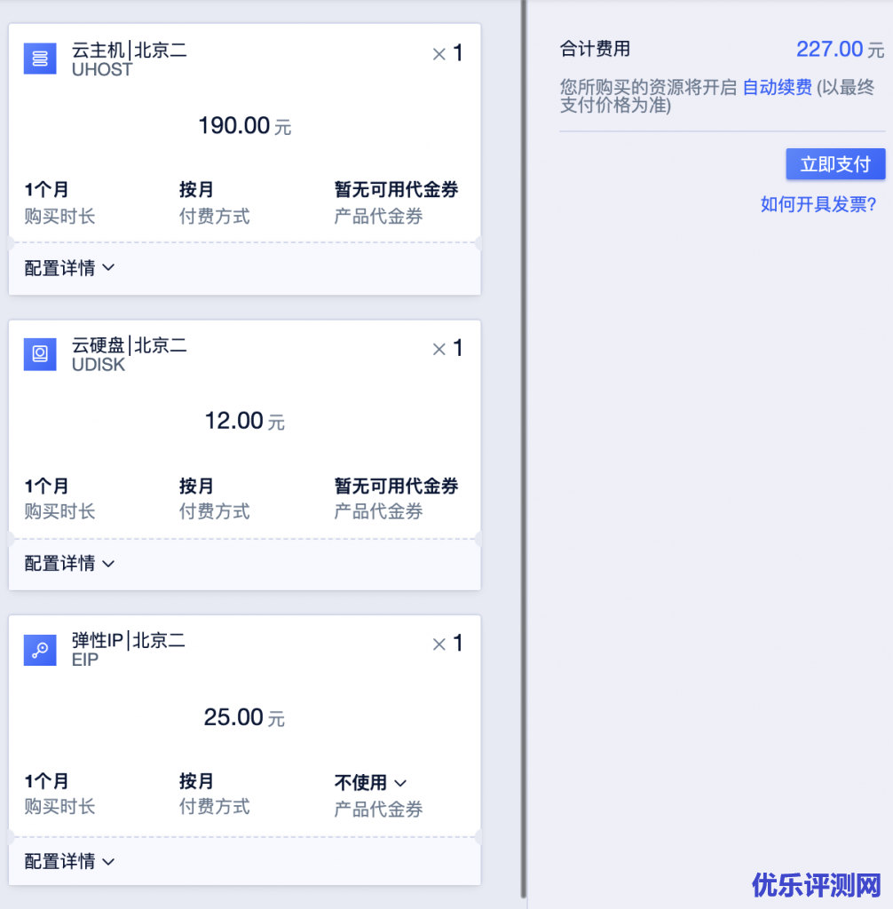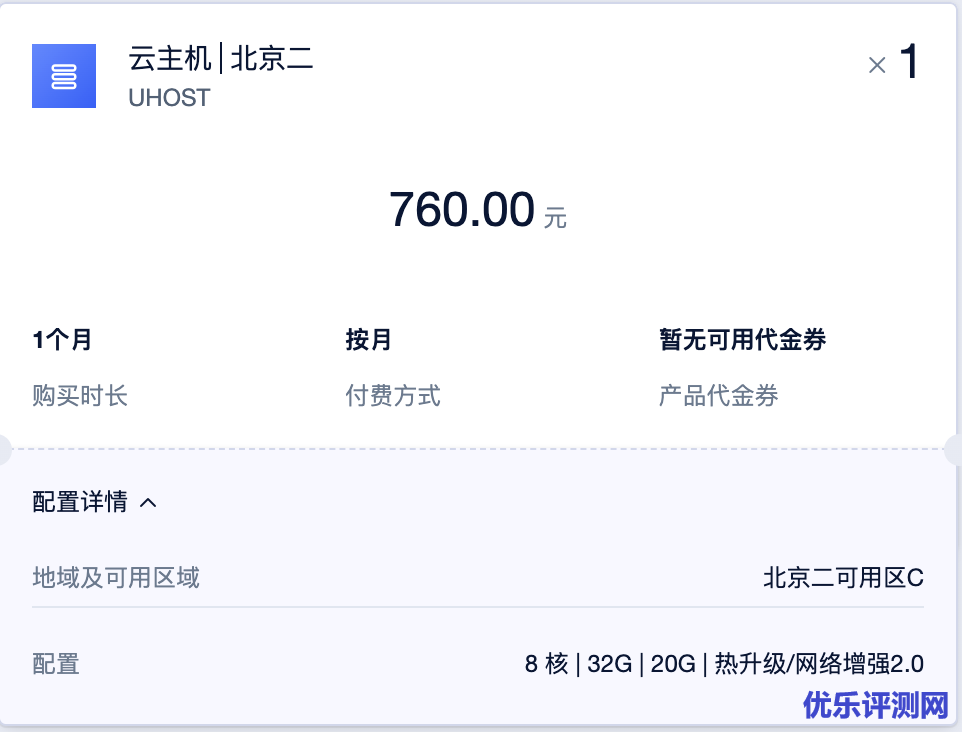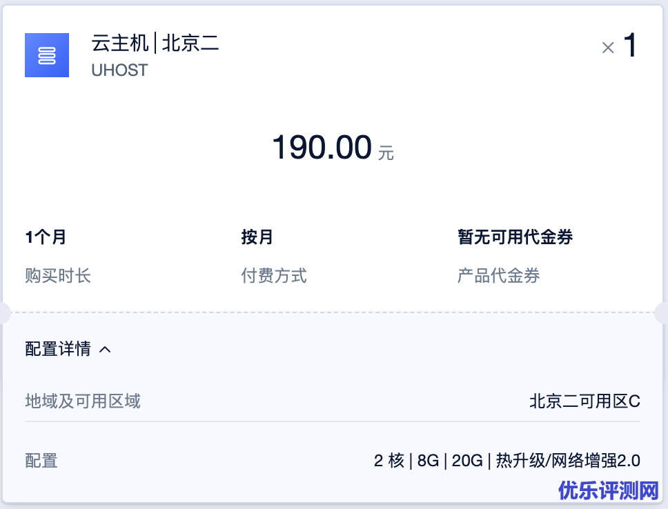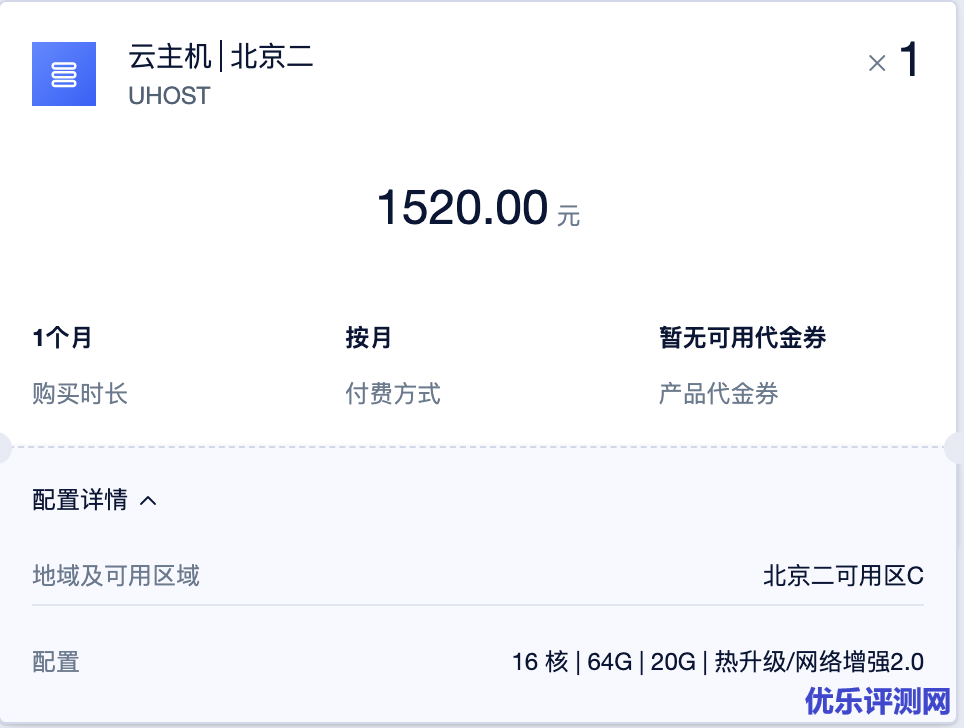 在价格查询时,我们发现,由于进入UCloud主机创建页时,若不调整选项,默认带1Mb外网带宽和20GB数据盘,三个配置项叠加的总价和《选型指南》表中展示的一致。以2核8G举例,227元/月正是在《选型指南》列出的UCloud快杰型价格。