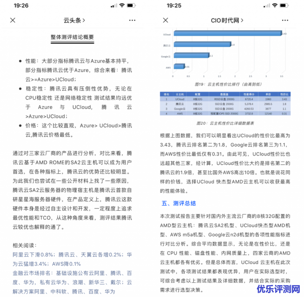 两篇相似主题文章,腾讯云SA2与UCloud快杰型云主机均位列其中,而性能/价格的结论都大相径庭。