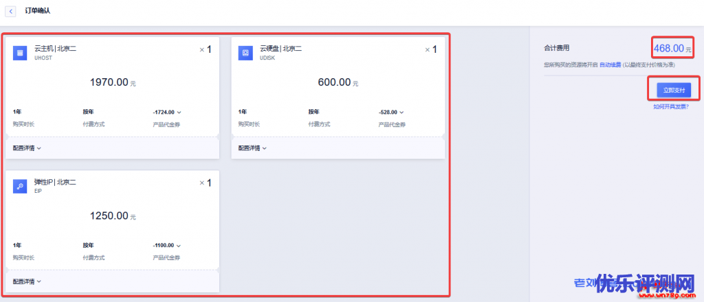 4、配置选择好了之后设置root密码就可以点击立即购买到“订单确认”页面了。这里我们就可以看到之前领取的优惠券都自动使用上了。接下来付钱就开通了。