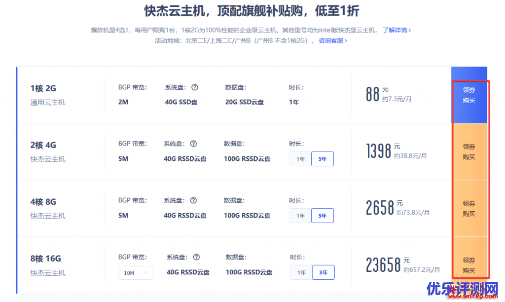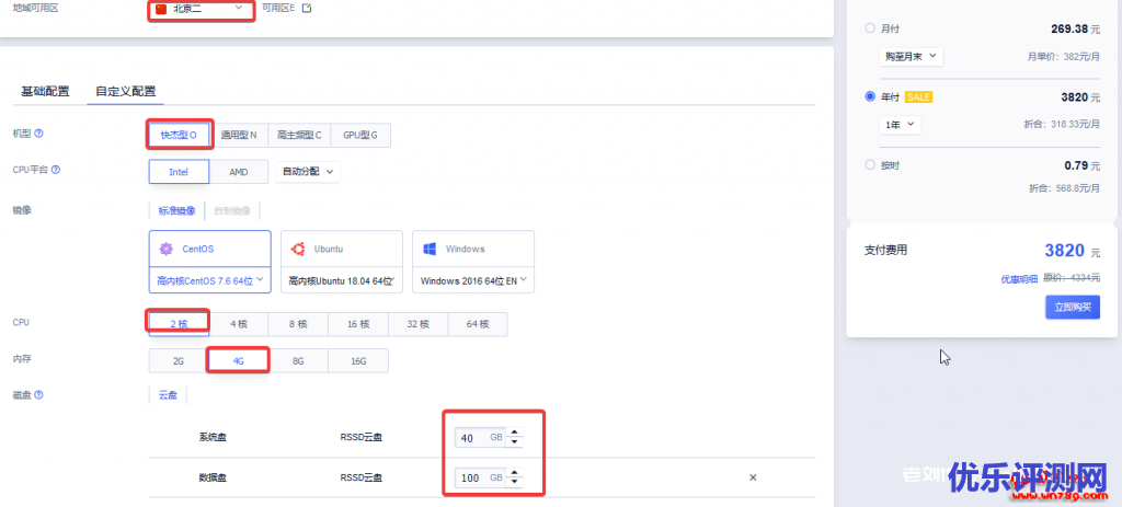 3、注意选购配置要与我们领取的促销配置一致。以蜗牛将要购买的快杰云服务器2核4G内存促销方案为例。首先我们找到数据中心,有快杰云服务器可以选的数据中心!北京、上海、广州有快杰云主机可以选择。上海还要选择“可用A区”!数据中心后面的可用区是可以更换的哦,其次就是对应的配置了,一定要选择“自定义配置”,CPU、内存、系统盘、数据盘、还有带宽均要选择与促销配置完全一致的!另外购买时间也一定要选对,蜗牛在下图右侧没有标注出来,蜗牛选择的是1年付款周期,所以勾选了年付、周期是1年!
