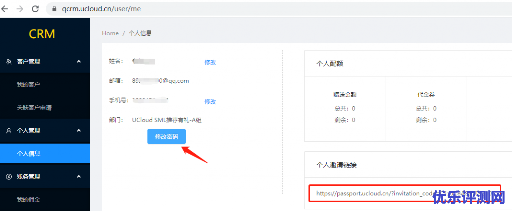 2,系统界面页,可以看到有客户管理(我的客户、关联客户申请、首日订单),个人信息(个人信息)和财务管理(我的佣金)[ 财务管理(我的佣金) 暂未开放]。进入个人信息可以看到自己的个人配额(忽略,不需要看这个)和个人推荐链接(和邮件给到的邀请链接一致),和“修改密码”按钮,点选进行修改登陆密码。这里也可以修改姓名和绑定的手机号。