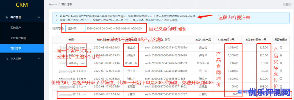 补充内容:老刘博客注意到,上周五UCloud他推荐系统已经上线了我的客户-首日订单查看功能。咨询了UCloud工作人员,其显示的数据解释如下: