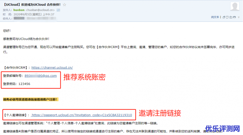 2,开通U大使CPS推荐系统账户时,UCloud账号注册邮箱将收到UCloud优刻得U大使CPS推荐系统账户和密码,以及新的个人推荐链接。所以一定要确保我们的注册邮箱是还在使用的,另外UCloud工作人员告诉我,带ytag的上一版推荐链接会在2020年6月30日24点后失效(即这个时间之前,老的推荐链接也是有效的,老推荐链接和系统新推荐链接同时计入返佣)。