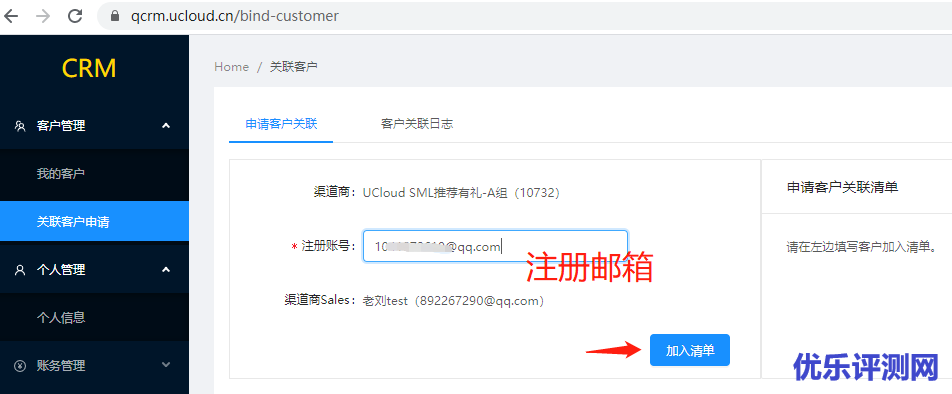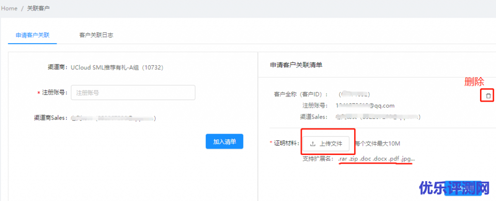 3,输入注册账户,点击“加入清单”后,上传证明材料,以证明这是我们推荐来的客户,证明材料格式包括压缩文件,文档和图片等。官方说只要材料能证明给客户发过我们的推荐链接以及客户把他的账号发了给你就可以说明是我们的客户了(这意思就是你开通推荐链接肯定是在客户注册账户时间之前)。提交证明材料清单后,等待UCloud工作人员审核通过或拒绝。