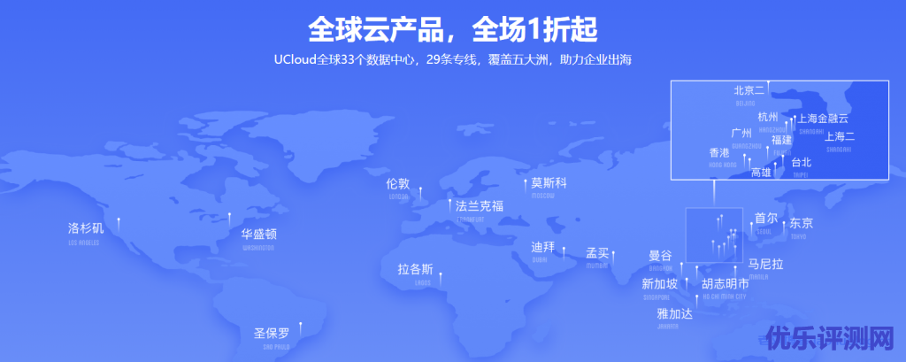 老刘来带大家一起了解下多台促销的具体活动内容,方便大家快速上手进行选购。特别注意:多台服务器3年限时特惠,新老用户均可购买,无台数限制,高性能企业级云服务器,100%CPU性能。如上图UCloud全球节点分布图所示,活动地域包括所有UClud非大陆数据中心,如中国台湾台北,中国台湾高雄,日本东京,韩国首尔,泰国曼谷,新加坡,印尼雅加达,越南胡志明市,俄罗斯莫斯科,德国法兰克福,英国伦敦,阿联酋迪拜,巴西圣保罗,尼日利亚拉各斯,美国华盛顿和洛杉矶等(香港可用区暂不参与此活动)。