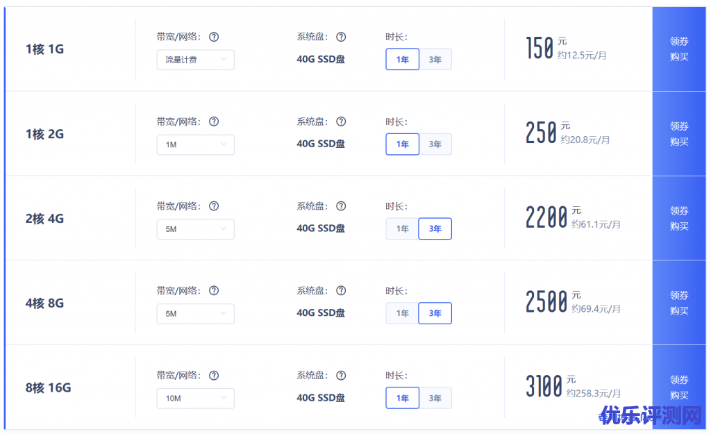 2核 4G 带宽/网络:流量计费 系统盘:40G SSD盘 时长:3年 1450元 约40.3元/月;