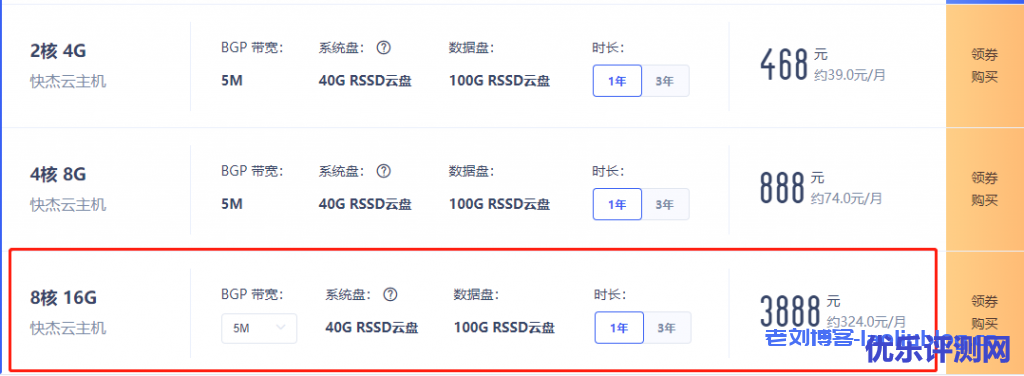(老刘博客特别推荐!!!)机房:香港免备案 8核16G BGP带宽10M 系统盘40G SSD云盘 时长1年3100元( 约258.3元/月 )/时长3年9200元( 255.6元/月 )。