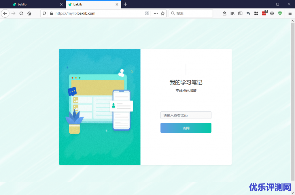 下图是密码访问的界面。比如上面我设置的域名是mylib.baklib.com打开后输入你上面设置的密码就可以查看你的笔记了。密码你自己可以随时修改。密码这个东西不必设置的太复杂,毕竟只是学习笔记而已,机密级别远不如银行卡密码、邮箱密码之类的。