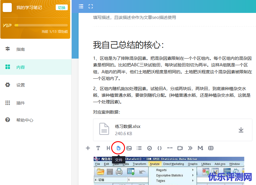 由于大部分时间你可能是在撰写笔记。所以撰写编辑器就是一个很重要的部分。他采用的是块级结构,向下堆叠的方式。十分简洁。可以直接复制粘贴图片或截图到文章中。可以插入附件,比如把对于练习数据Excel直接上传到文章中。这样时间长了复习起来就很方便,不用到电脑中去找练习数据了。另外一个好处是支持markdown,用过的都知道好。