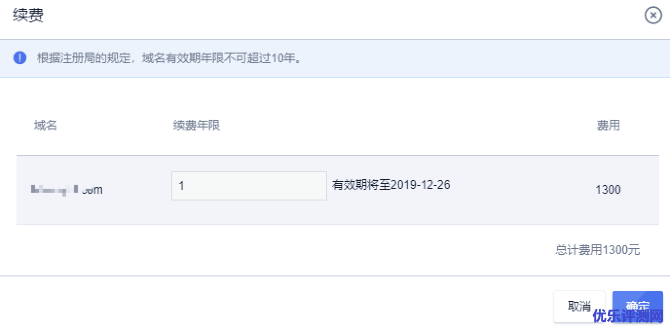 续费价格:域名有效年限不可超过10年,单个域名最多续费9年。