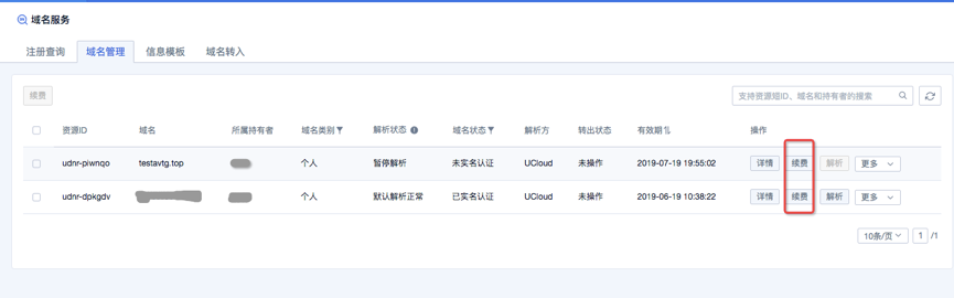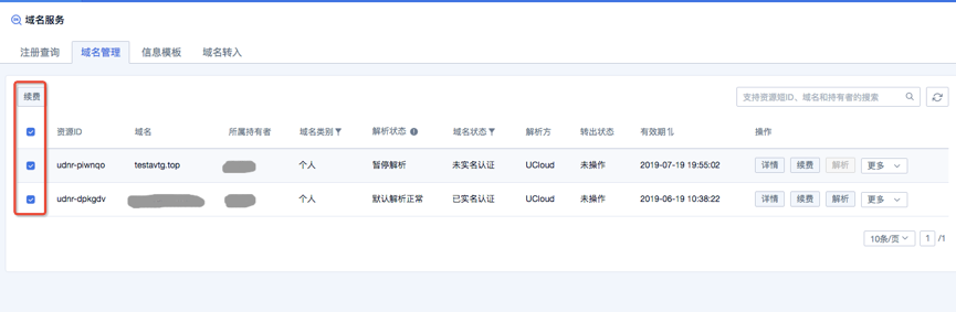 在UCloud域名到期前,都会收到UCloud发送的邮件或短信通知,提醒对域名产品及时续费。建议你至少在有效期到期前1个月进行续费。支持单个/多个域名续费。