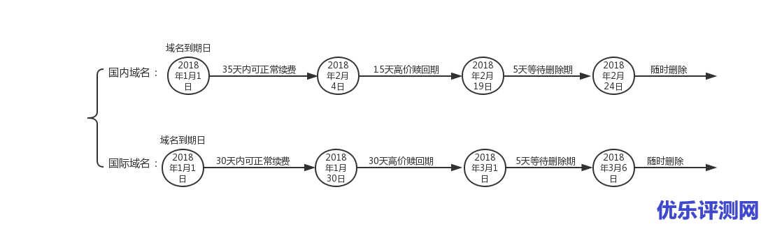 1)国内域名(包含中/英文 .cn、.中国、.公司、 .网络 的域名等)到期后,通常有35 天续费宽限期。错过了续费宽限期,就会进入15天或30天的域名赎回期。错过赎回期,将进入 5 天的等待删除期。在等待删除期,域名不能续费,也不能赎回,只能等待被删除。过了 5 天等待删除期,将直接向公众开放重新注册。