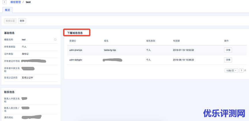 点击[详情]进入信息模板详情界面。此界面展示和此信息模板有关的“下属域名”列表。