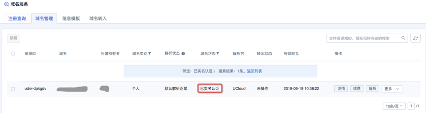 1.域名完成购买后,状态为“未实名认证”,点击[更多]下面的[实名认证],对此域名进行实名认证。